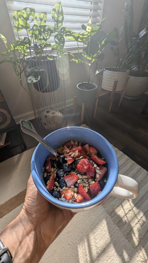 I’ve also noticed that I have a clearer head and more energy to plow through my workouts. I’m less hungry throughout the day. That first meal sets the tone.