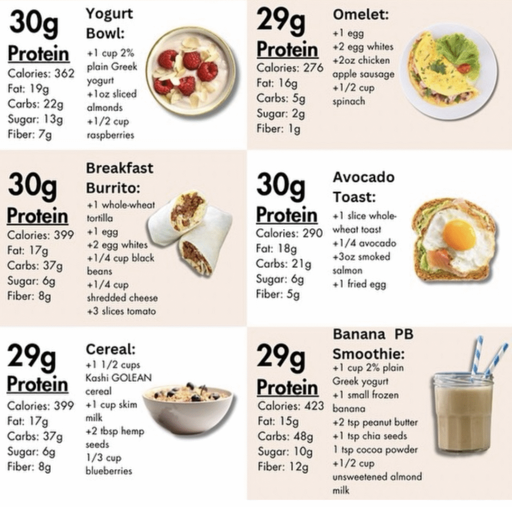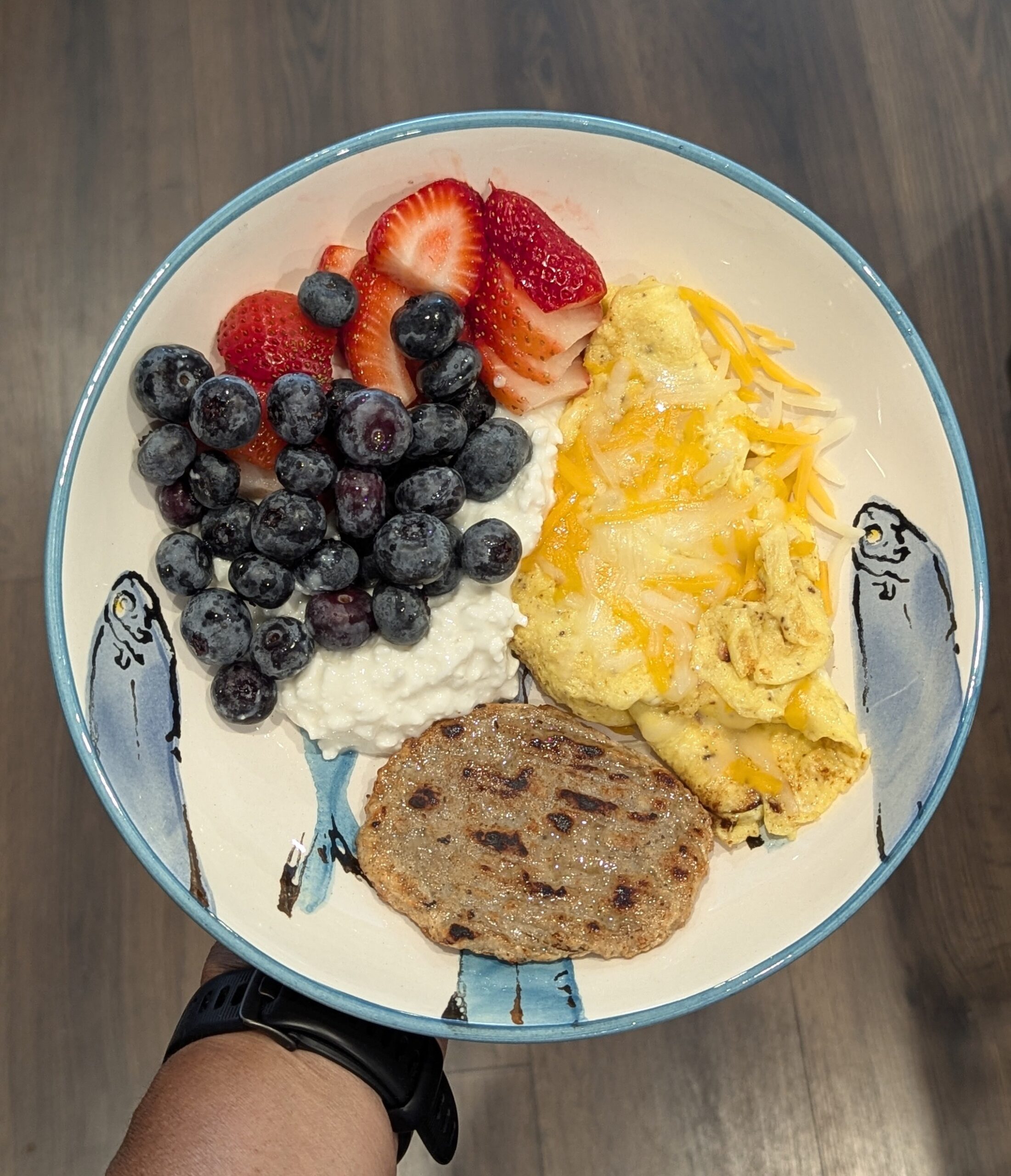 My go tos meals are oatmeal with cottage cheese, blueberries & strawberries, and pumpkin seeds. My second favorite is two eggs with chicken maple sausage, cottage cheese with blueberries. I strive for 30g of protein for breakfast while remaining under 400 calories.