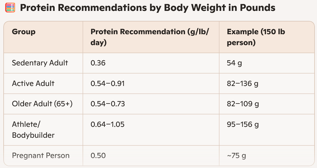 - Example: A 150 lb person might need 82–150 g/day